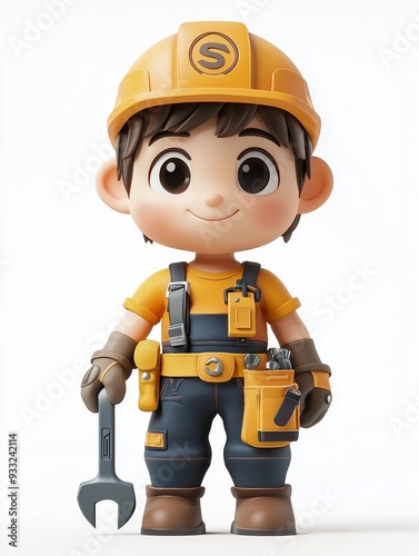 A cute chibi construction worker holding a wrench, dressed in a yellow helmet and work uniform. Perfect for construction or labor-themed designs.