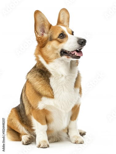 A cute Corgi dog sits attentively, looking alert and happy, with its signature short legs and large ears against a white background.