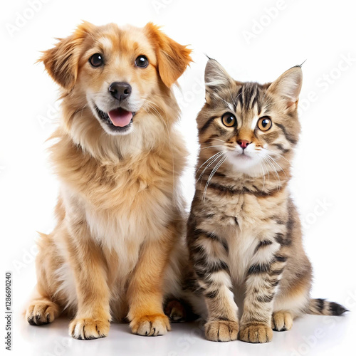 A cute dog and cat sitting together, isolated on a white background,