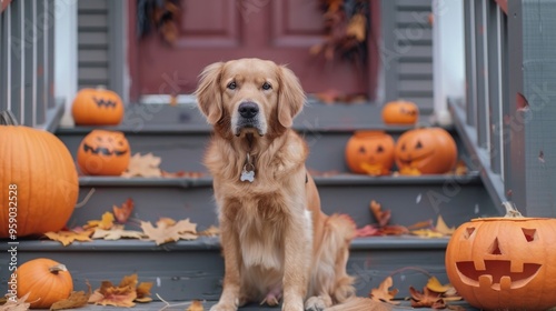 a cute dog sits on the stairs near the pumpkins. Halloween holiday. Jack-o'-lantern. Autumn holiday. Traditional party