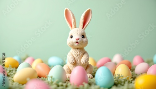 a cute easter bunny figurine, surrounded by a variety of colorful eggs in pastel hues, creating a festive and joyful easter scene.