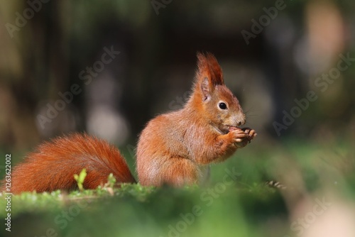 squirrel, wild, wildlife, wild animal, red, orange, nature, natural, portrait, closeup, closeup, sit, green, grass, eats, food, nut, mammal, fauna, animal, cute, adorable, sweet, small, quick, funny, pretty, europa, european, czechia, czech republic, bohemia, german, poland, france, tiny, little, spring, springtime, blurred background, sunny