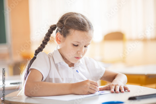 A cute girl sits in a classroom at a desk during a lesson. The child is in first grade. The girl learns lessons. Back to school. School supplies on the desk.
