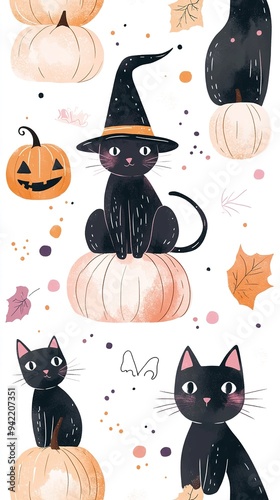 A cute Halloween-themed design featuring adorable witches, pumpkins, and black cats with friendly, smiling faces.