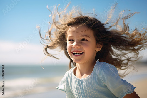 A cute, happy little girl enjoys a joyful summer vacation by the