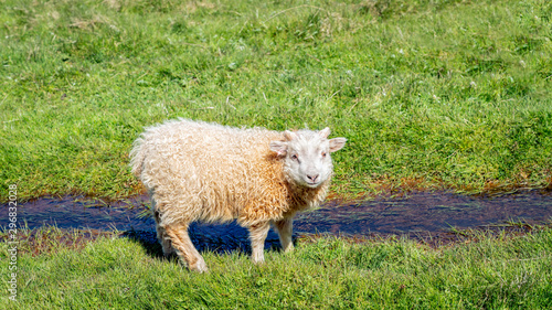 A cute Icelandic sheep by a small river of water looking at the camera, Iceland