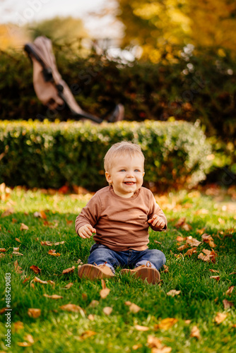 a cute little blonde boy in a brown sweater on a green lawn with autumn leaves.