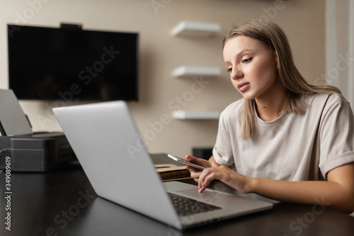 A cute pensive girl does work from home, scans information on the phone and checks it against information on the computer during quarantine and pandemic.