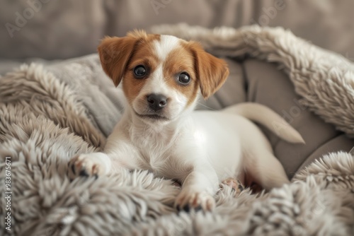 A cute puppy resting on a fluffy blanket, with a soft focus background. The puppy's curious eyes and soft fur create an endearing and cozy scene.