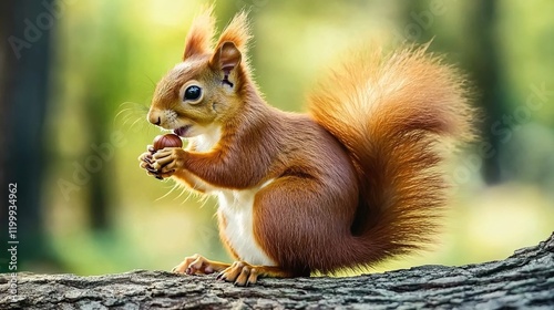 A cute squirrel is sitting on the tree trunk and eating an acorn in a forest background.