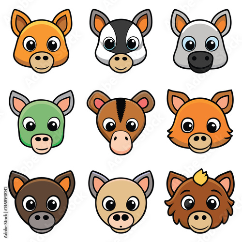 A cute vector collection of funny baby animal faces including cat, dog, bear, rabbit, pig, fox, panda, and cow characters, perfect for zoo illustrations
