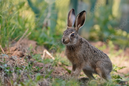 A cute young european hare sits on the field. Lepus europaeus. Wildlife scene with a baby hare