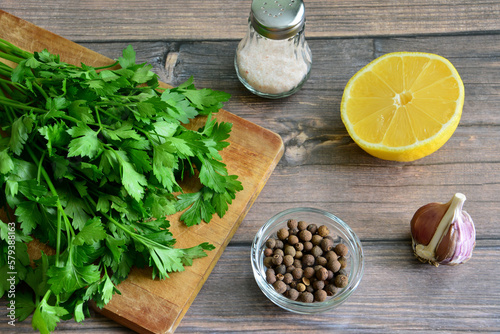 A cutting board with ingredients for a salad including parsley, lemon and salt