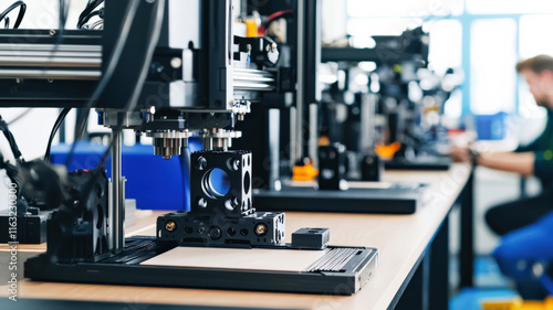 A cutting-edge 3D printing factory with massive printers crafting intricate prototypes, workers overseeing precision layering, and shelves showcasing futuristic, innovative designs in a high-tech work