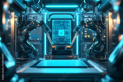 cybernetic, laboratory, three-dimensional, background, state, art, dais, robotic, arm, adjusting, advanced, ai, metallic, wall, shimmer, blue, neon, circuit, cutting, edge, technology