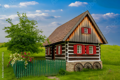 house, home, grass, sky, building, bungalow, landscape, architecture, nature, rural, country, old, farm, tree, wooden, blue, countryside, roof, village, summer, wood, garden, hill, traditional, forest, spring, window, europa, beautiful, season, timber, recreation, bohemia, hut, cabin, relaxation, czech, czech republic, nice