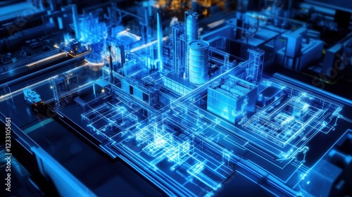 A D holographic projection of a factory layout on a futuristic dark background.