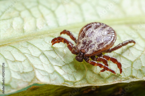 A dangerous parasite and infection carrier mite sitting on a green leaf