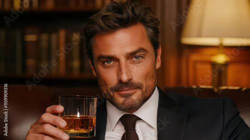 A dapper man in a tailored suit, sipping whisky with a subtle smirk, luxury furnishings in the background