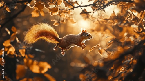 A daring red squirrel leaps between tree branches, its bushy tail catching the golden sunlight.