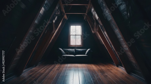 attic, room, window, dark, light, couch, wood, floor, beam, ceiling, interior, home, house, loft, space, empty, rustic, vintage, cosy, cabin, comfortable, relax, architecture, design, style, natural, shadow, pattern, texture, grain, detail, wooden, wooden floor, natural light, window light