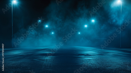 A dark, empty street with abstract blue asphalt serves as a backdrop for a studio room with neon lights, spotlights, and smoke, creating an interior texture for product displays
