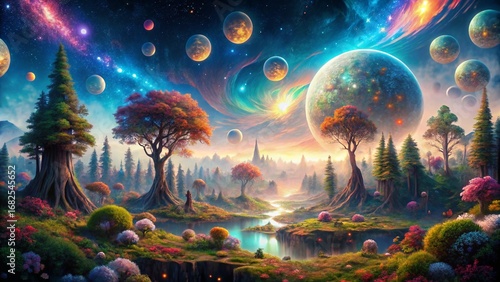 A dark fantasy landscape of a mystical forest under a starry night sky with a crescent moon and distant planets