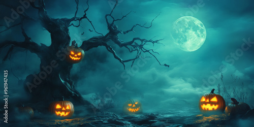 A dark, foggy scene with glowing jack-o'-lanterns, a twisted tree, and a full moon casting eerie shadows.