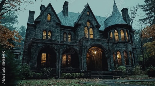 luxury home, gothic, architecture, stone, window, light, tree, autumn, foliage, eerie, landscape, historic, skittish, evening, atmosphere, design, structure, nature, outdoors, environment, shadow, beauty, detail, symmetry, entrance, step, garden, old, mysterious, ambience, twilight, park, dark, vintage, classic, heritage, scene, rustic, tranquil, quiet, night, haunted, charme, elegance, residential, property, setting, view