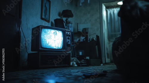 living room, television, static, dark, night, furniture, lamp, carpet, wall, decor, retro, ambience, quiet, home, shadow, screen, glow, television, room, atmosphere, electronic, indoor, vintage, lighting, relaxation, entertainment, leisure, cosy, solitude