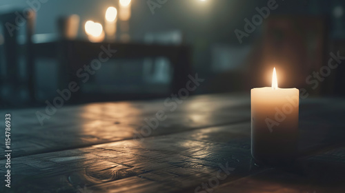A dark room with a single candle flickering on a wooden table, symbolizing a power outage. The soft glow of the candle highlights scattered items, creating a serene and peaceful atmosphere. Shot in th