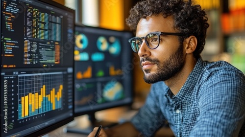 A data analyst meticulously reviews financial data and charts displayed on multiple monitors in a well-lit office, demonstrating concentration and expertise in his analysis