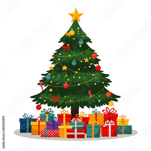 christmas, tree, ornament, star, gift, present, holiday, celebration, festive, decoration, season, winter, evergreen, pine, spruce, bauble, light, garland, ribbon, bow, box, wrapped, colourful, bright, gold, red, green, blue, yellow, purple, striped, polka, dot, pattern, design, illustration, vector, graphic, art, traditional, christmas, december, new, year, eve, merry, happy, joy