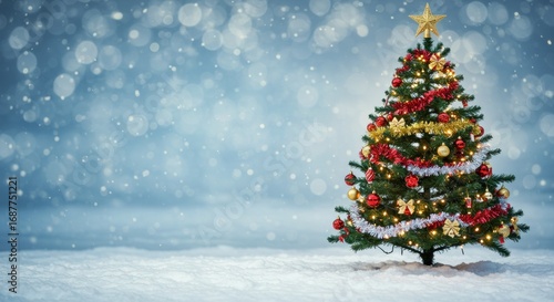 A decorated Christmas tree stands in a snowy landscape, illuminated with festive lights and ornaments.