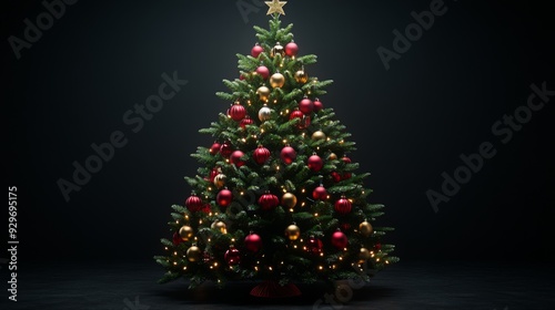 A decorated Christmas tree with red and gold ornaments and twinkling lights on a black background.