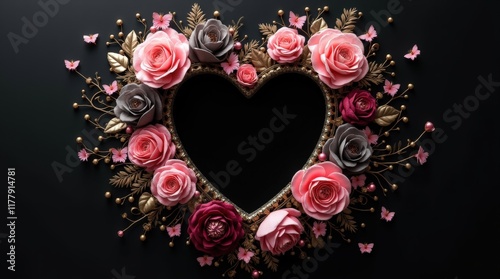 A decorative floral heart glowing softly with golden accents and butterflies against a bold black background.
