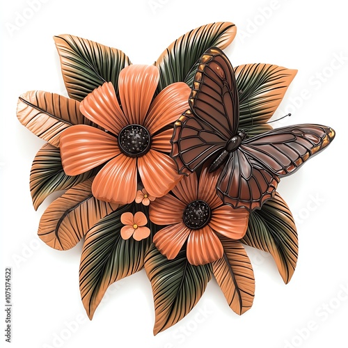 A decorative piece featuring orange flowers and a butterfly with intricate leaf designs, perfect for home decor.