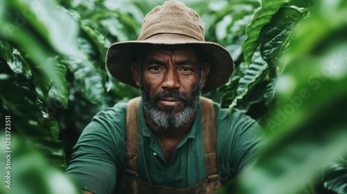 A dedicated farmer with a hat and beard works amidst lush green coffee plants, showcasing the beauty of agriculture and the connection to nature in his environment.