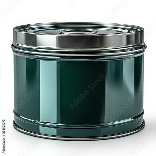 green, can, metal, container, cardboard box, storage, lid, closed, isolated, white background, blank, product, shiny, studio shot, marketing, branding, commercial, contemporary, modern, minimalist, clean, generic, front view, single object, nobody, cut-out, closeup, detailed, professional, high-quality, realistic