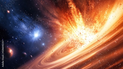 A deep-space tsunami of iridescent stardust reshapes planetary systems, creating new celestial patterns