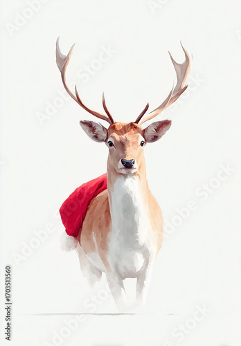 A deer with a red Santa hat on its back. The deer is standing in front of a white background