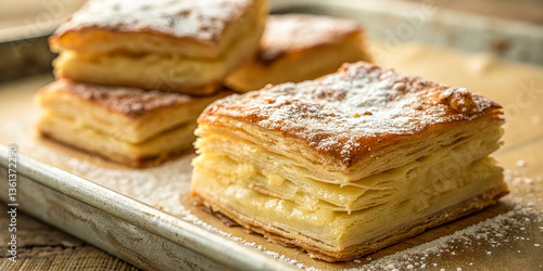 A delectable close-up of golden-brown layered pastries dusted with powdered sugar, revealing rich, creamy layers between the flaky, textured crust.