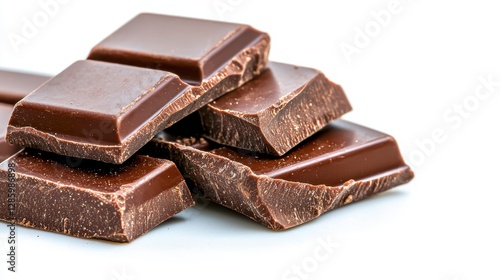 A delectable pile of smooth chocolate pieces invitingly displayed on a clean white background, perfect for culinary artistry