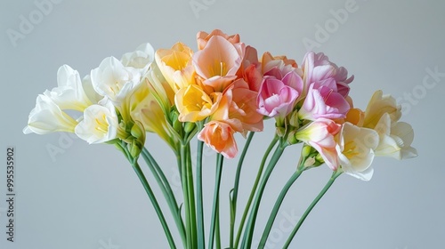A delicate bouquet of fragrant freesias, their delicate, trumpet-shaped blooms in a variety of pastel hues, exuding a timeless and elegant charm