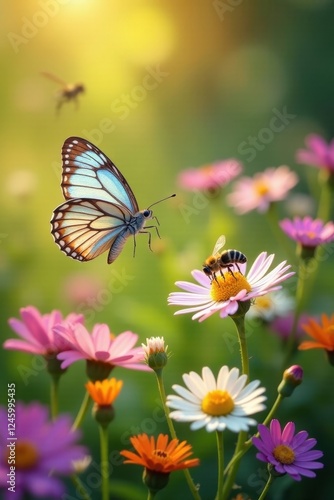 A delicate butterfly and a busy bee share a vibrant meadow of wildflowers bathed in golden sunlight, a serene moment of nature's artistry