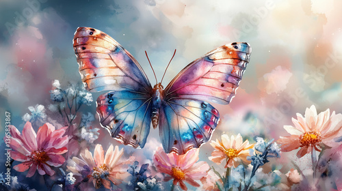 A delicate butterfly painted in soft watercolors, its wings filled with pastel shades of pink, blue, and purple.
