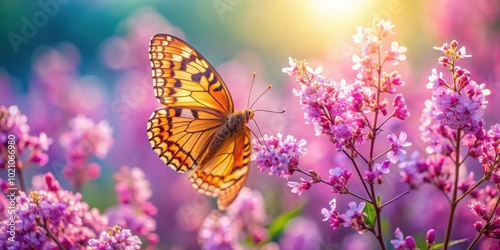 A delicate butterfly with intricately patterned wings rests on a cluster of vibrant pink blossoms in a field bathed in soft, golden sunlight.