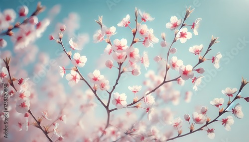 A delicate cherry blossom branch with soft pink and white flowers swaying gently in a light breeze against a clear blue sky Generative AI