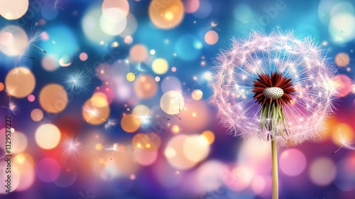A delicate dandelion seed effortlessly floating in the air surrounded by a dreamlike glowing and vibrant background of soft colorful bokeh lights