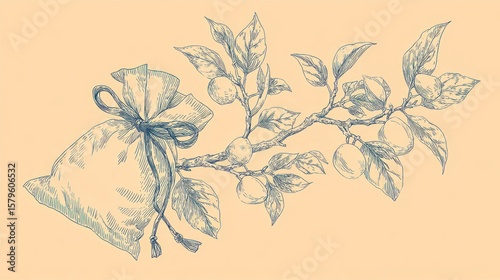 tree branch, plum, leaf, bag, tied, light, drawing, vintage, pale, pastel, illustration, graphic, art, line, vignetting, decorative, fruit, nature, organic, design, pattern, detailed, elegant, gentle, hand, drawn, botanical, textured, soft, cream, background, toned, muted, shadow, crayons, image, artistic, decor, still, life, hanging, bound, twine